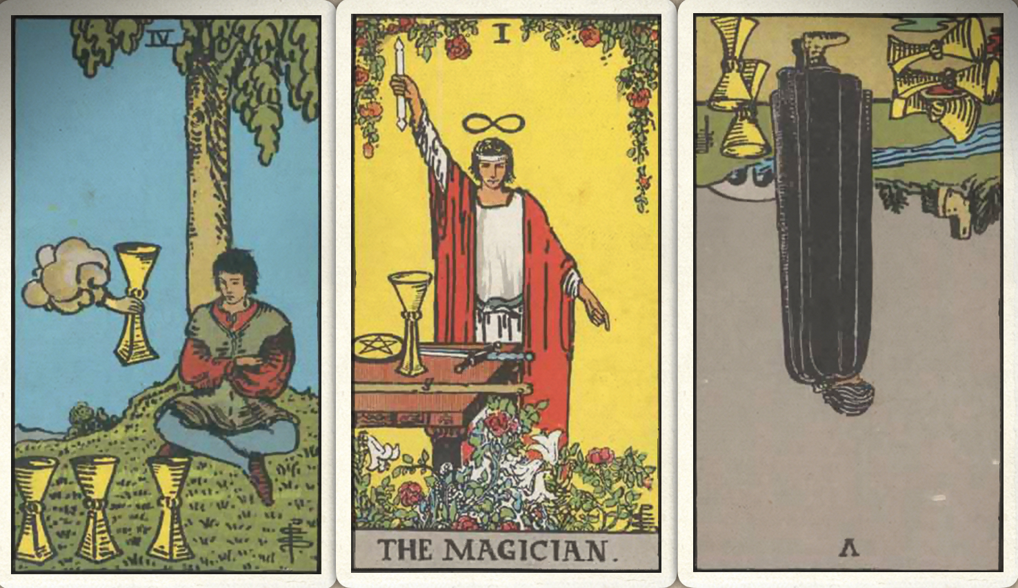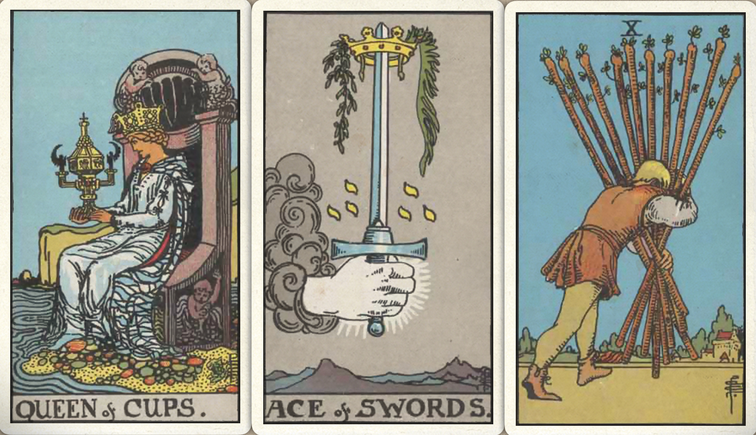卜牌:圣杯皇后+ 宝剑首牌+ 权杖十+