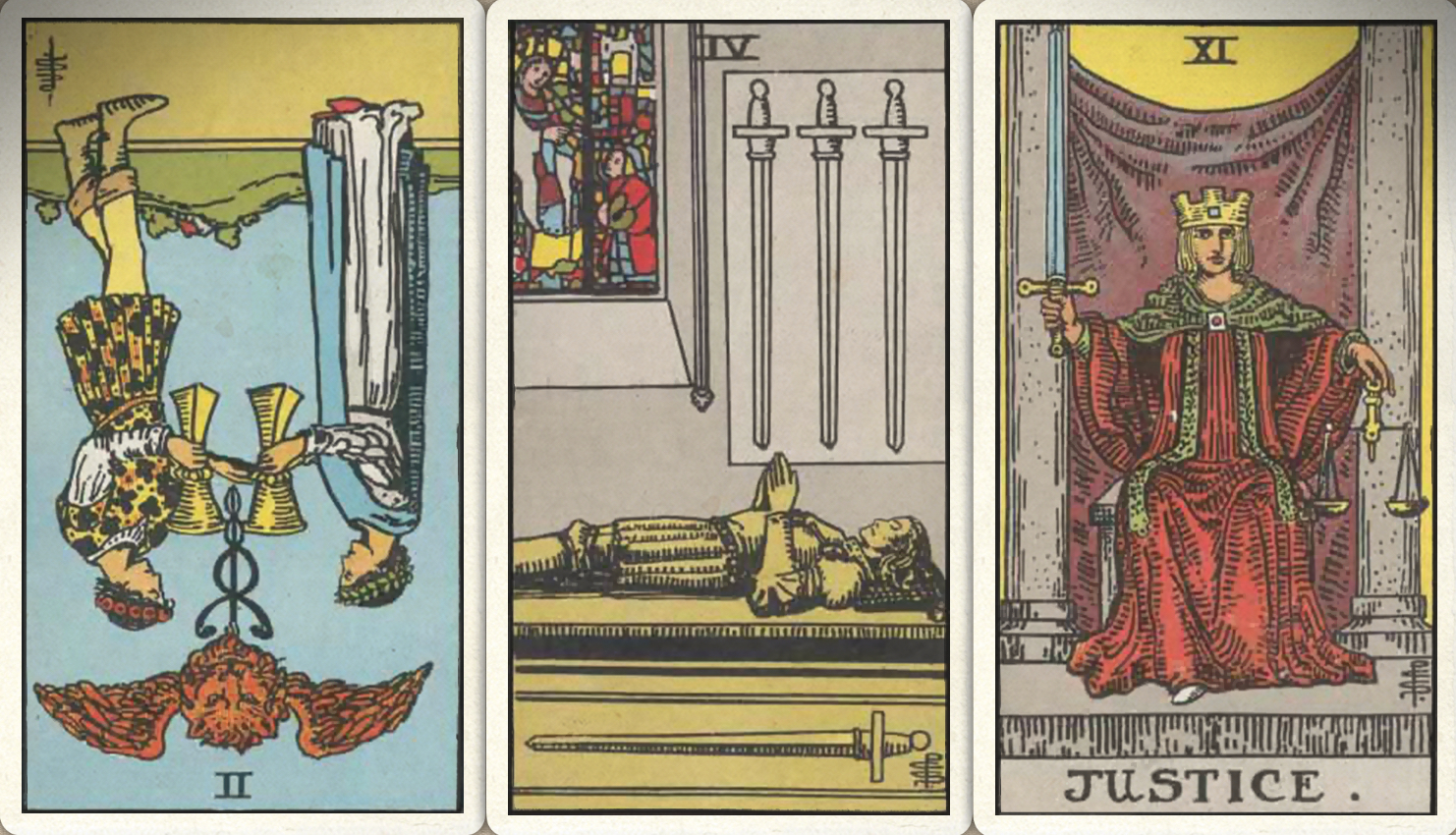 卜牌:圣杯二- 宝剑四+ 正义+