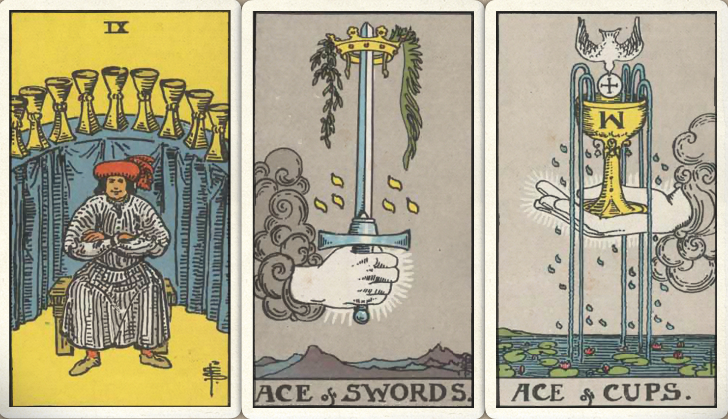 卜牌:圣杯九+ 宝剑首牌+ 圣杯首牌+