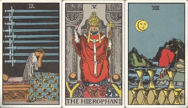 卜牌:宝剑九+ 教皇+ 圣杯八+