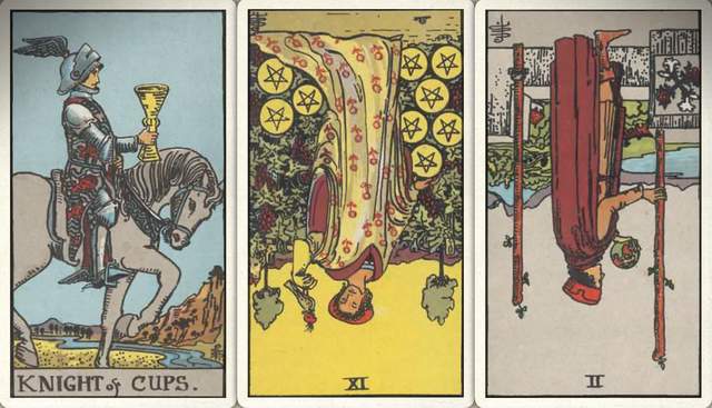 卜牌:圣杯骑士+ 星币九- 权杖二-