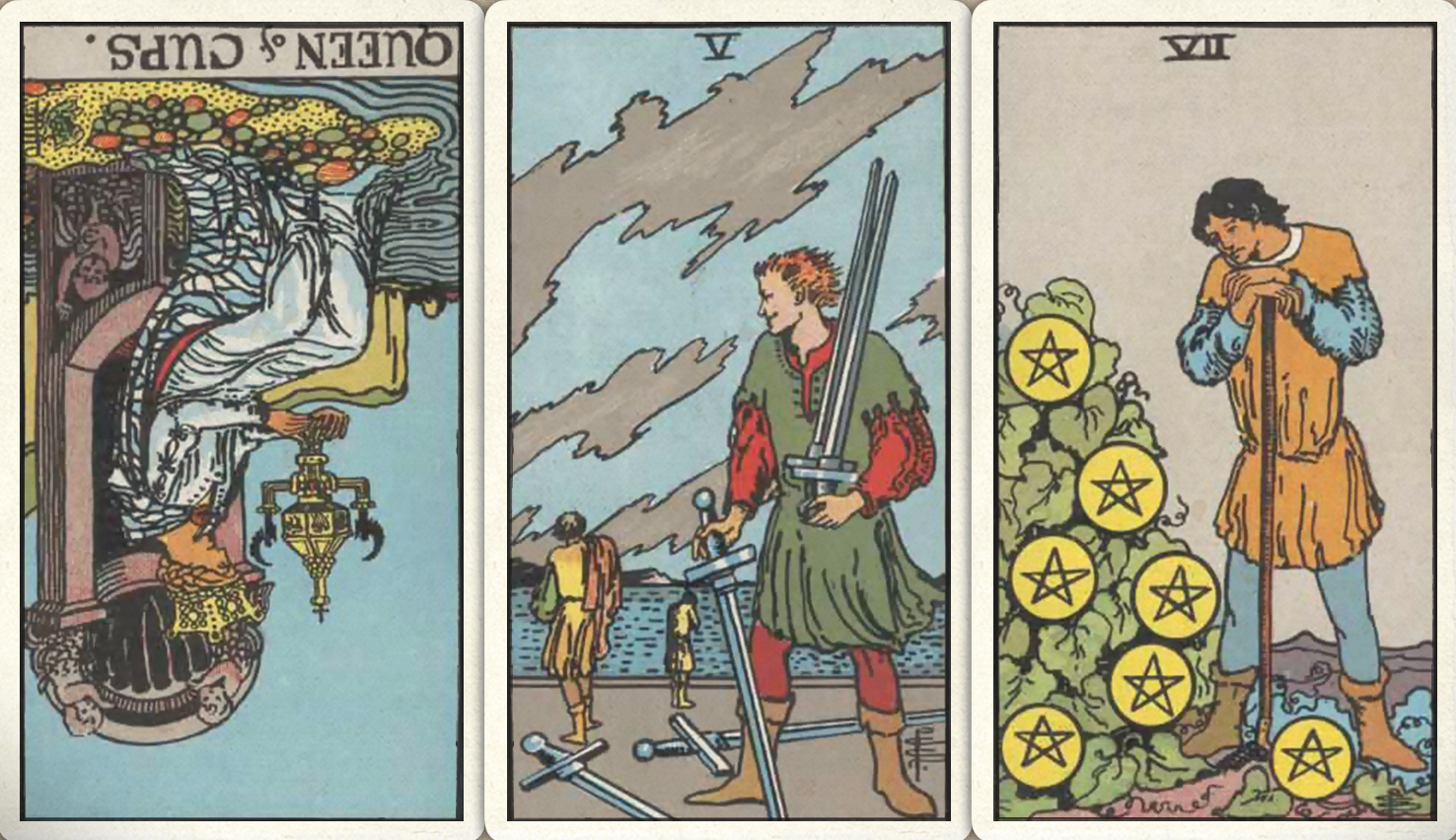 卜牌:圣杯皇后- 宝剑五+ 星币七+
