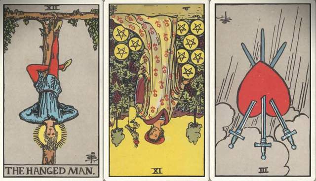 卜牌:倒吊人+ 星币九- 宝剑三-