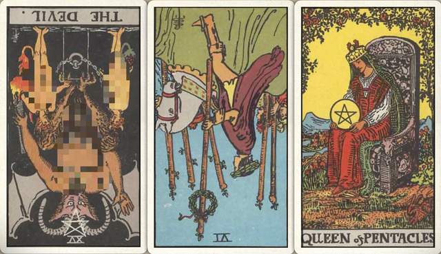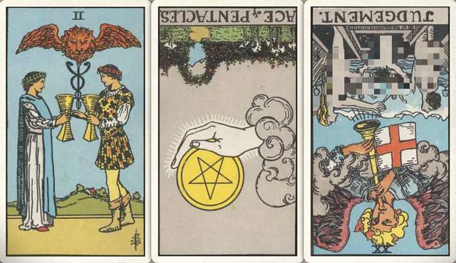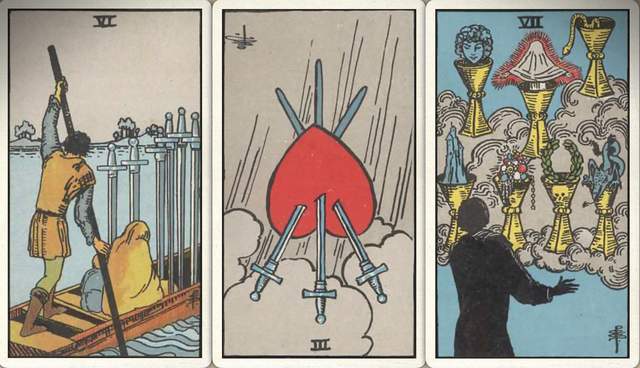 卜牌:宝剑六+ 宝剑三- 圣杯七+