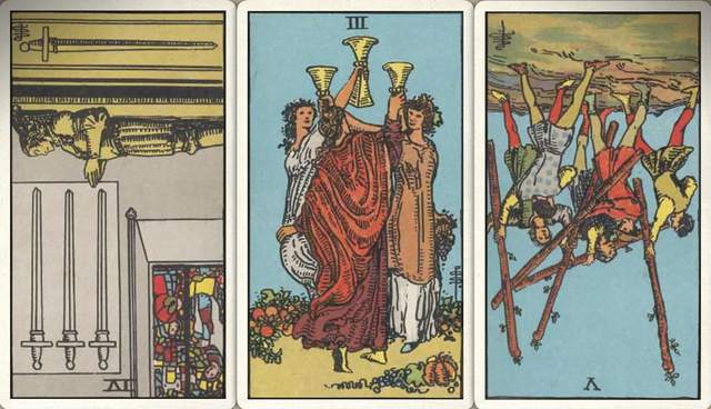 卜牌:宝剑四- 圣杯三+ 权杖五-