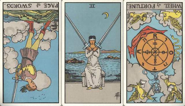 卜牌:宝剑侍从- 宝剑二+ 命运之轮-