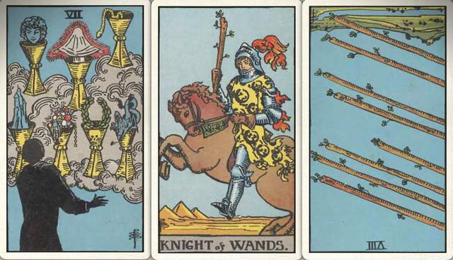 卜牌:圣杯七+ 权杖骑士+ 权杖八-
