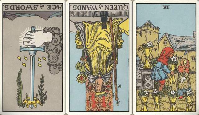 卜牌:宝剑首牌- 权杖皇后- 圣杯六+