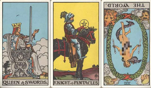 卜牌:宝剑皇后+ 星币骑士+ 世界-