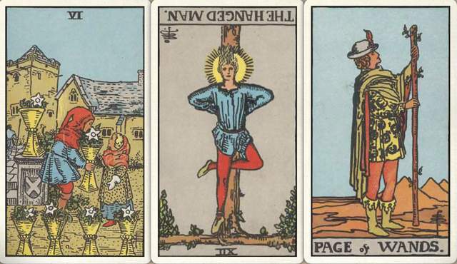 卜牌:圣杯六+ 倒吊人- 权杖侍从+