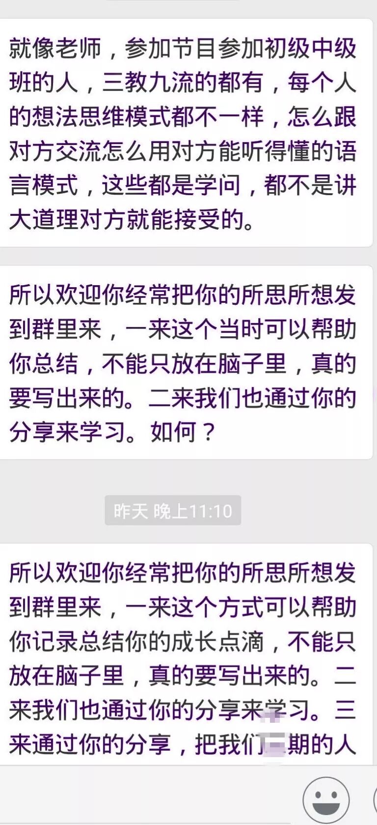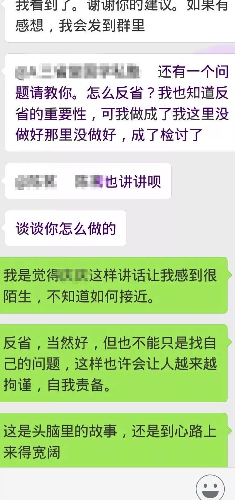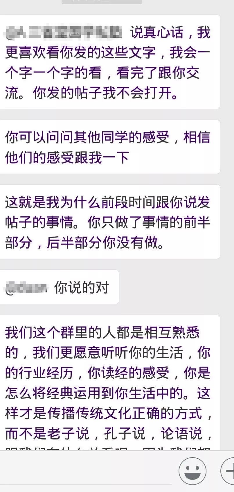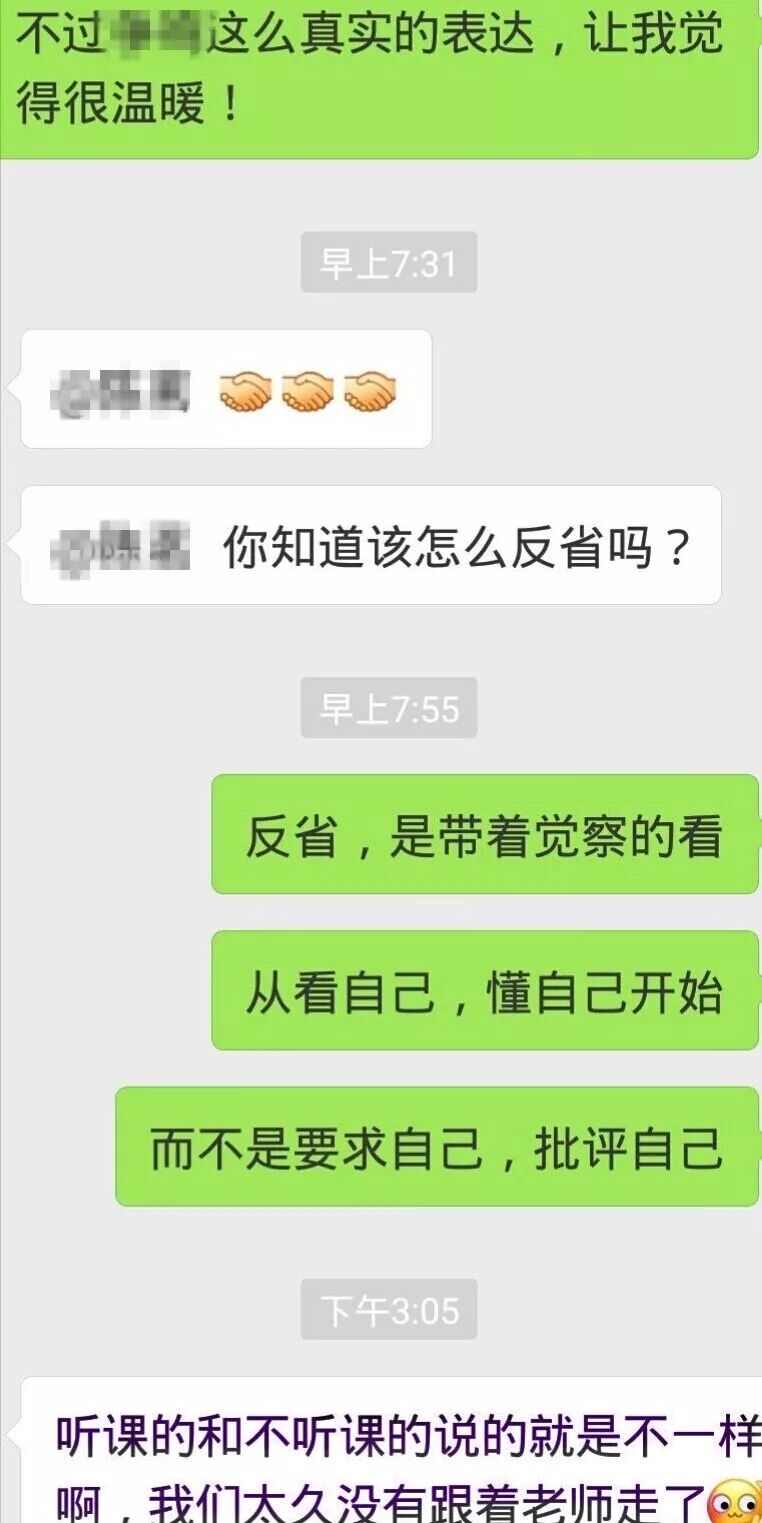 下面就是某期新建期群里,大家重新连接,彼此分享,真实而完整地呈现了这些年走在不同路上的学员的状态,黑色和紫色字体的都是离开团队很久的学员,绿色是离开一段之后重新回归跟随的学员,一场关于国学关于知行合一关于觉察的讨论之后,其中一位由衷感叹——听课的和不听课的说的就是不一样啊!我们太久没有跟着老师走了!