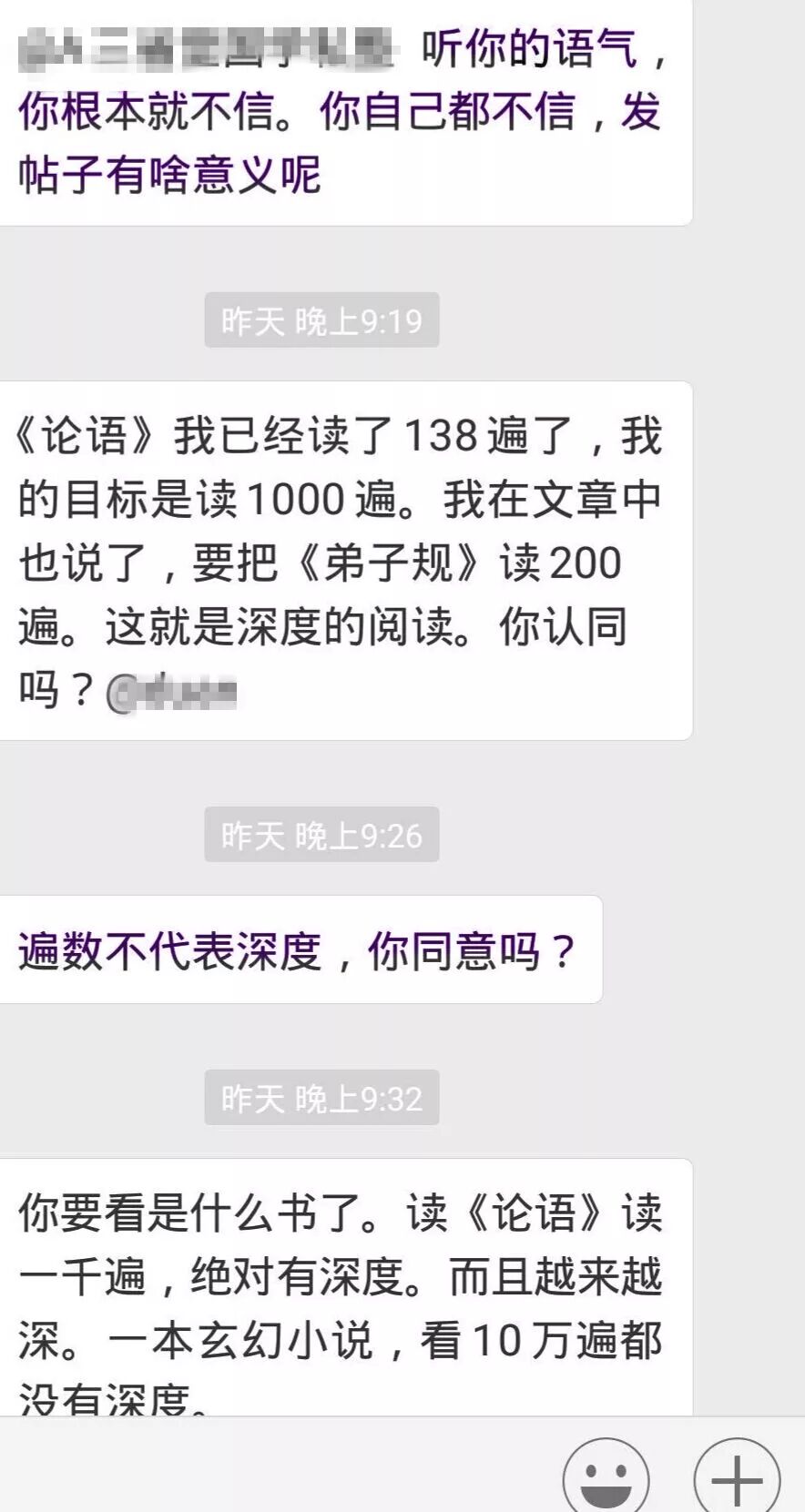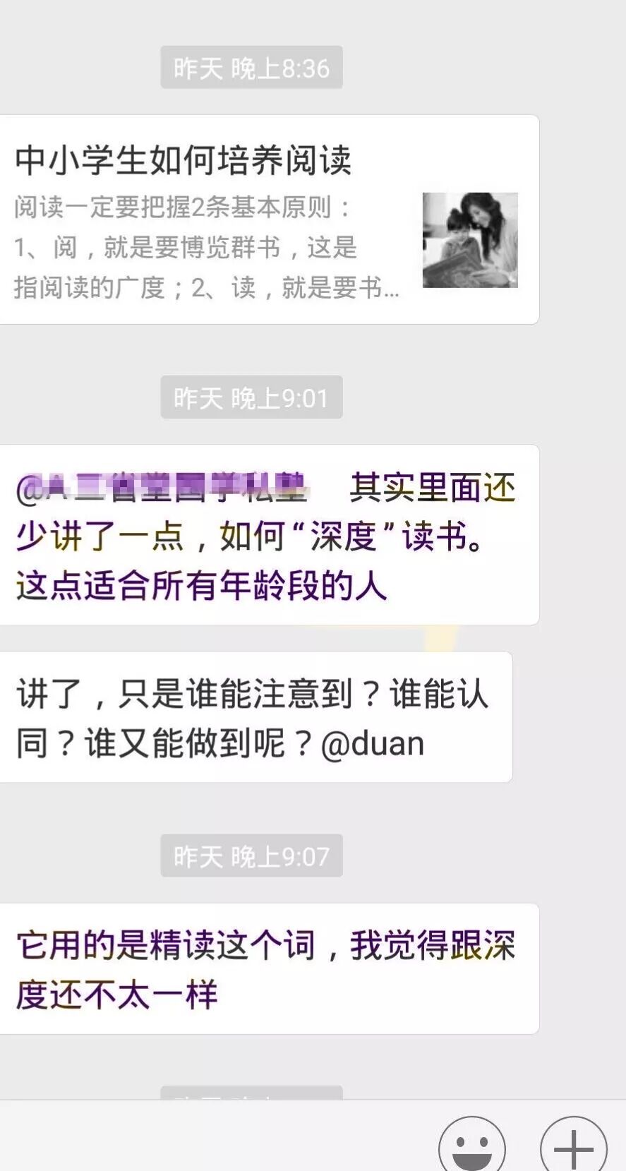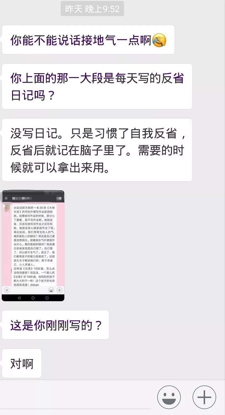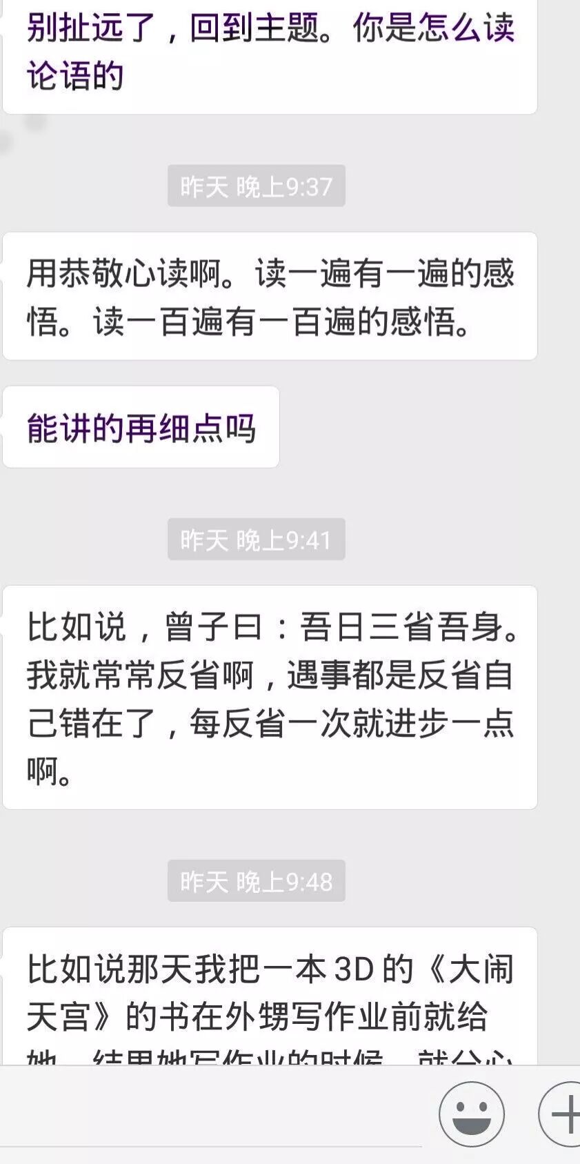 下面就是某期新建期群里,大家重新连接,彼此分享,真实而完整地呈现了这些年走在不同路上的学员的状态,黑色和紫色字体的都是离开团队很久的学员,绿色是离开一段之后重新回归跟随的学员,一场关于国学关于知行合一关于觉察的讨论之后,其中一位由衷感叹——听课的和不听课的说的就是不一样啊!我们太久没有跟着老师走了!