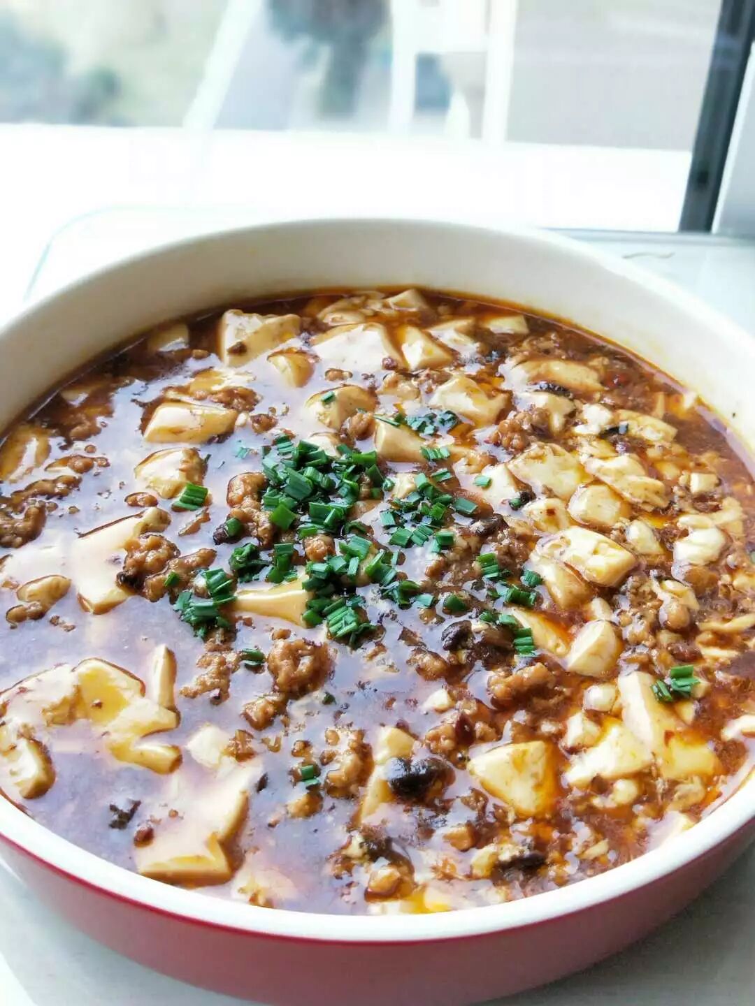 3. 接着小火炒香蒜末,一大勺老干妈,下肉沫变色即可,加水,可以没过豆腐即可,水烧开调味,盐,几滴酱油,下入豆腐,小火煮十来分钟入味,改大火倒入勾芡水,收汁,胡椒粉,盛盘,撒葱!欧克!