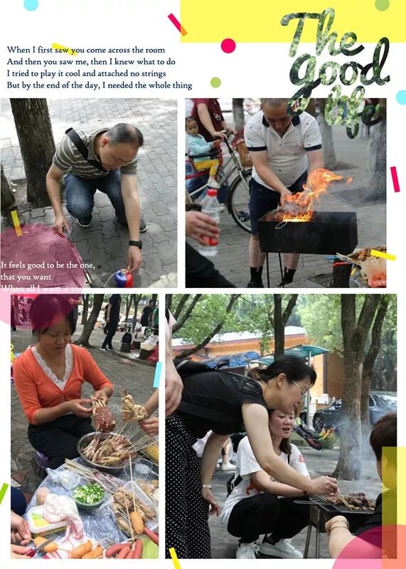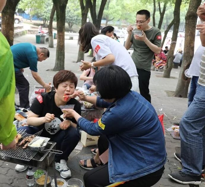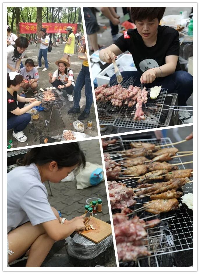 其实,这次活动很成功,烧烤的时候虽然分的是十人一个炉子烧烤,但是好像没有谁是真正的围着自己的炉子跟前的哈,大家都是各自拿一个碗和一双筷,闻香而动啊,哈哈哈…….,那个场面实在是太滑稽了吧,这边东西一烤好,香味马上会招来一群吃货的人群,转个身就没有了,接着另一边的熟了,战斗力又会转移方向,继续一抢而空,真的是玩出纯真的本性来了。