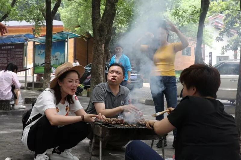 一整张的小石桌上摆满了烧烤的食材,娟姐带来的凉面那叫一个供不应求啊,不会开车的娟姐早上是拎了两三个袋子来的;还有小兰的炒菜,为了保证新鲜,她早早的起来炒好并分装好;我们的三哥虽然不会做,但也带来了一大堆的卤菜;君君带来的水果为我们餐后消食带来了大贡献,煮出了一杯杯美味的水果茶;还有队长、还有耀光………