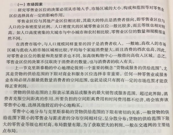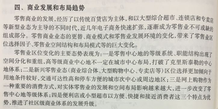 “零售业空间模型”在第三版中,框架进一步细分为“零售业空间类型与结构”、“零售引力模型”、“商业发展与布局趋势”。“零售业空间类型与结构”与“零售引力模型”的表述与第二版无异。“商业发展与布局趋势”为新增内容。