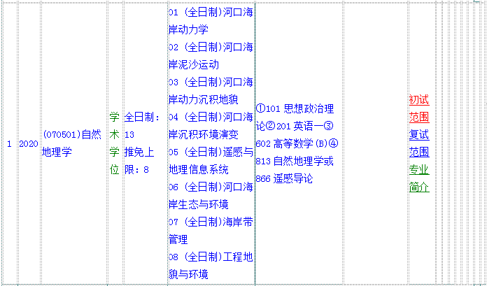 地科院和河口所都有自然地理,根据19年的报录情况显示,地科院报录比1:4.5,河口所1:3.25,相对来说河口所的竞争会小一些,河口所的专业课可以选考813自然地理学or866遥感导论。