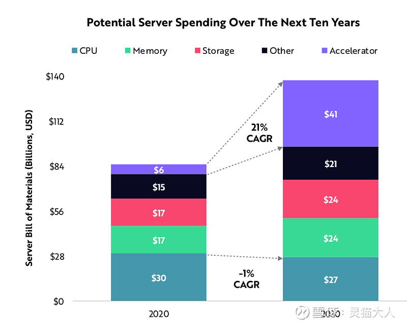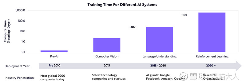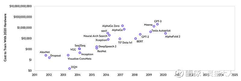 AI项目的培训成本之所以从1美元增至1亿美元,主要是用在了GPU和TPU这种专用处理器上,它们占据了绝大多数成本。A