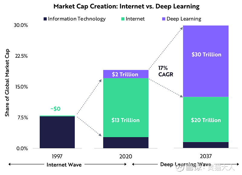 ARK的研究显示,深度学习将在未来15-20年里,为全球股票市场增加30万亿美元的市值。