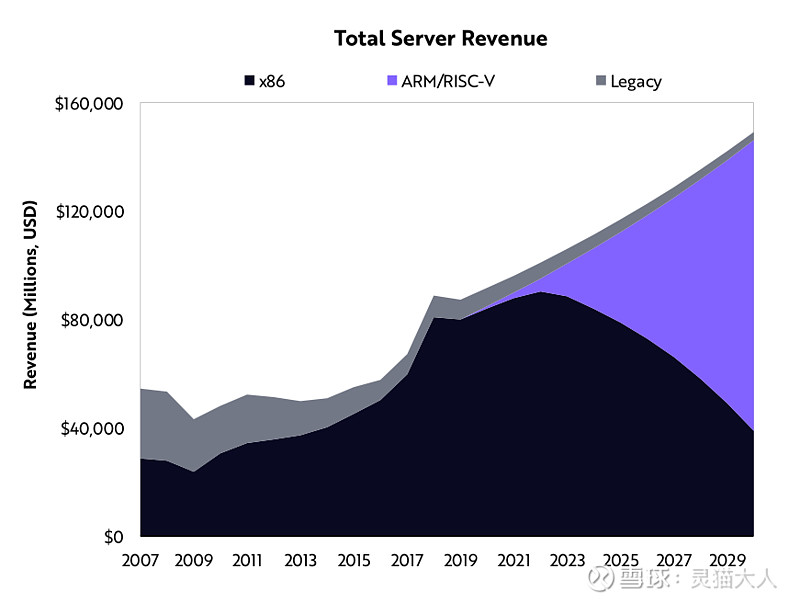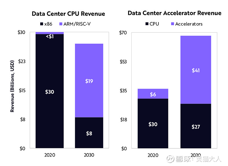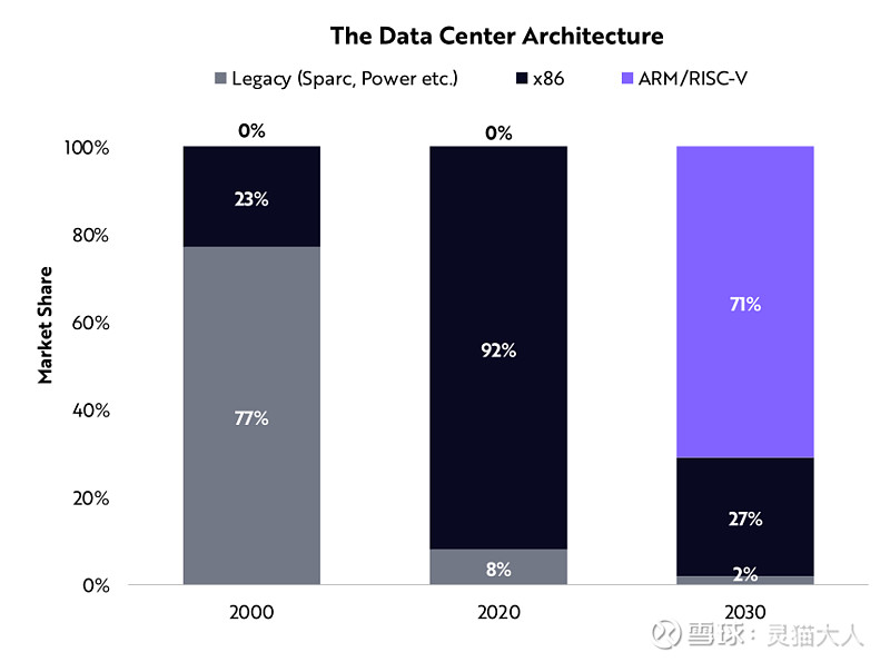 数据中心的最近一次重大迁移是从上世纪90年代的RISC处理器转移到到英特尔的低成本PC衍生x86架构。利用PC市场的规模,英特尔颠覆了高端市场当时的竞争格局。如今,ARM处理器正在利用移动生态系统的规模化来吞噬英特尔的市场份额。通过将开源规则应用于硬件,RISC-V正在成为低成本计算的一种标准。我们相信,ARM+RISC-V的组合所占据的服务器市场份额,将从2020年的零,增加到2030年的71%。
