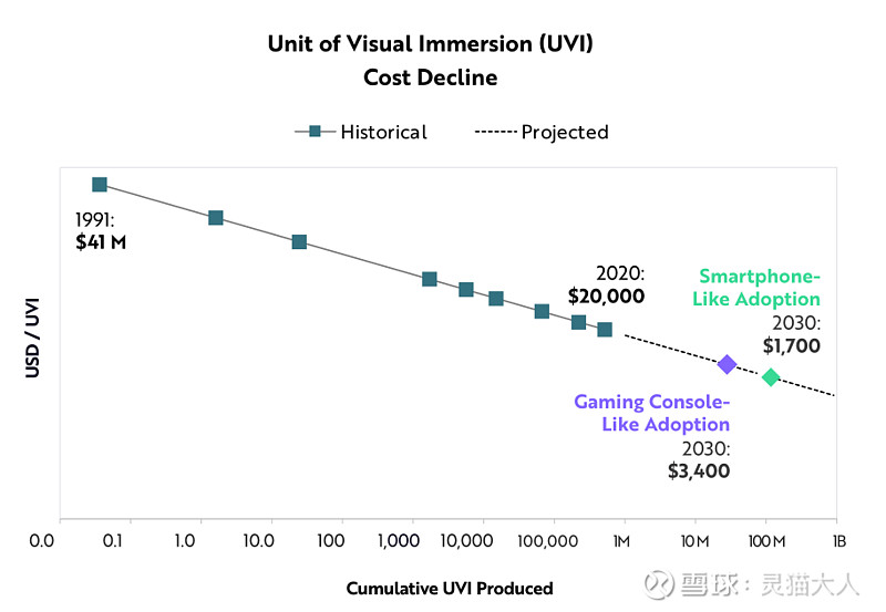 根据我们专有的评分系统,如今,一流的VR穿戴设备也只能达到人类视听觉体验的10%。如果消费级VR设备局限于控制台游戏市场,那么VR穿戴设备将难以拓展至沉浸式体验的大众市场。根据莱特定律,若纯粹的虚拟现实交互式控制系统价格与基于PC系统的价格相当,那么在2030年之前,VR头戴式设备的产量和成本曲线将都走出一条雷同于智能手机的曲线。