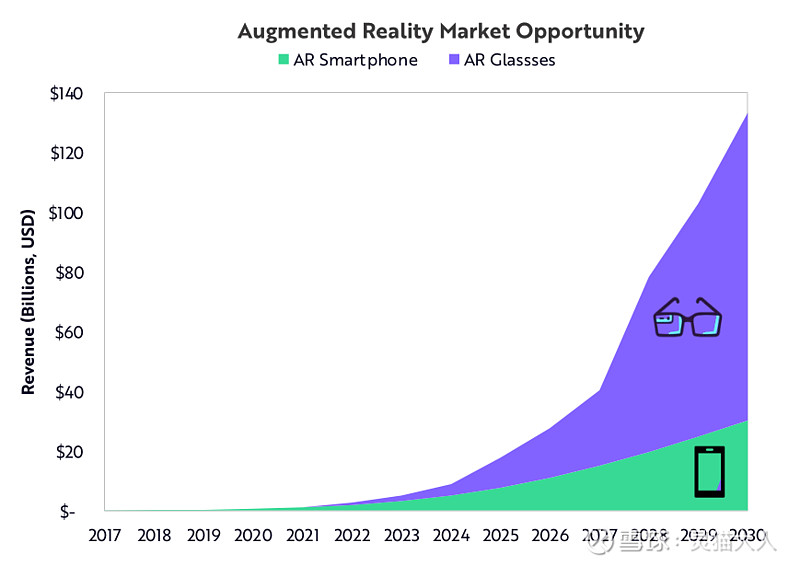 过去几年,诸如Snapchat、Facebook、Apple等大型科技公司增加了对AR的投资,鼓励了AR工具在移动端更为广泛的应用。到2022年,消费级AR头戴设备将出现井喷式暴增趋势。ARK预计,到2030年前,AR的市场规模可以从今天的不足10亿美元增长至1300亿美元。