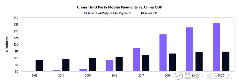 在短短5年内,中国的移动支付规模爆炸式增长了15倍以上,从2015年的大约2万亿美元,增加到今天的36万亿美元左右,接近于2020年中国GDP总量的三倍。