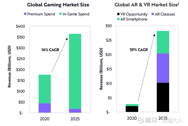 根据我们的研究,未来5年,全球游戏市场将会以每年16%的复合增长率扩增,规模从2020年的1750亿美元增至2025年的3650亿美元。AR和VR市场未来五年将以每年59%的复合增长率,从30亿美元的市场规模增至2025年的280亿美元。