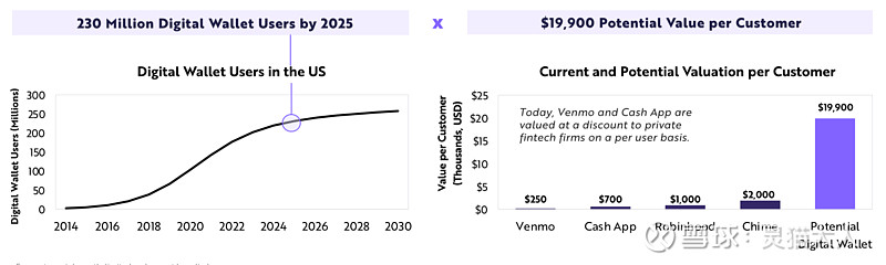 •根据ARK的研究,如今,每位用户的数字钱包价值在250美元到1900美元之间,有可能扩增到2万美元,这意味着到2025年,美国将有4.6万亿美元的市场机会。