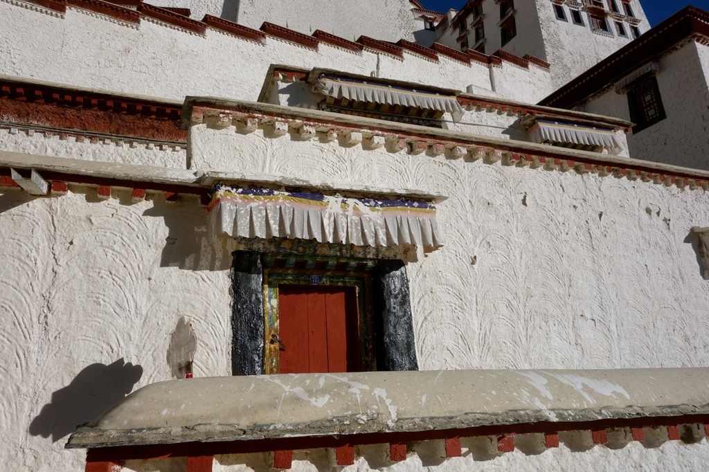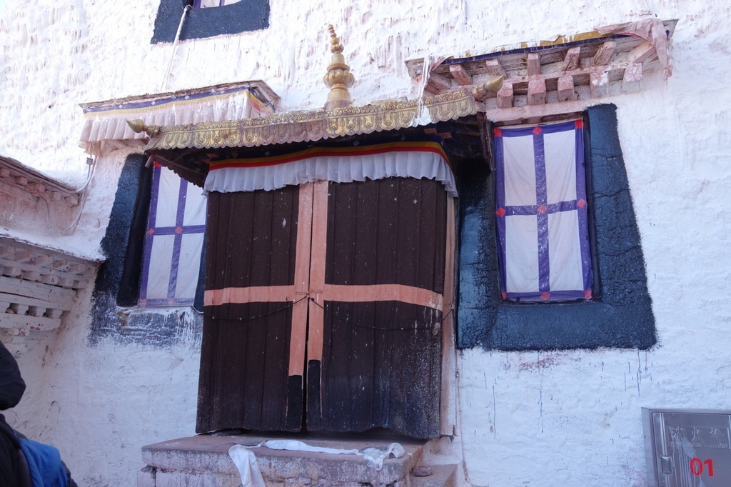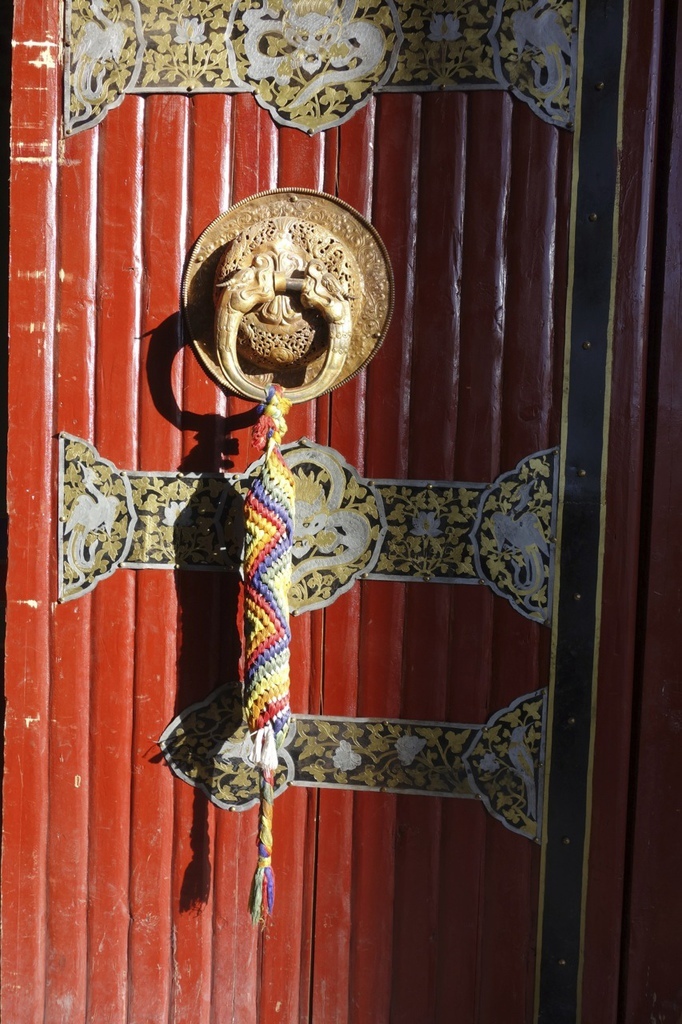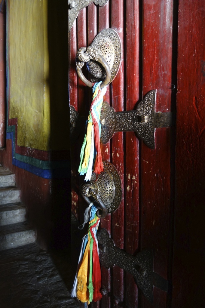 門把上都會綁著哈達,除了捐獻香油錢之外,也會有很多人放哈達。(就是下面類似絲巾的東西)