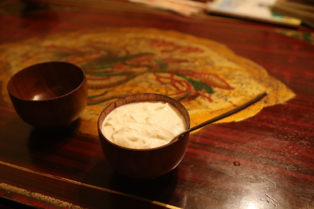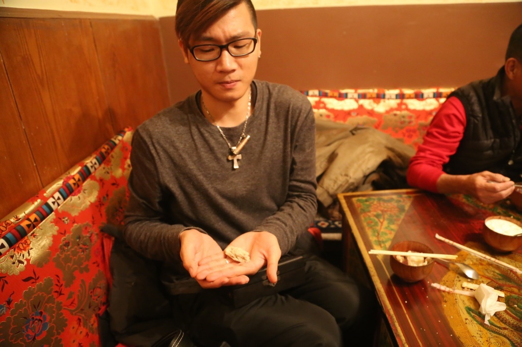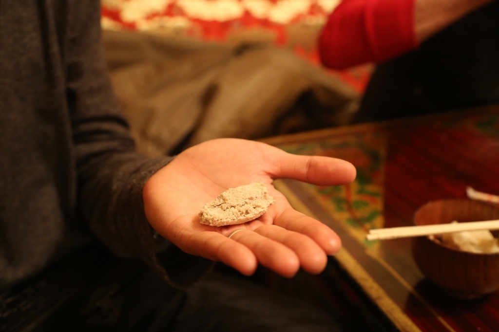 西藏主食,攢巴。就是用青稞粉加酥油揉成一坨,吃起來就不是很好吃這樣。就像圖下有點皺眉的FU