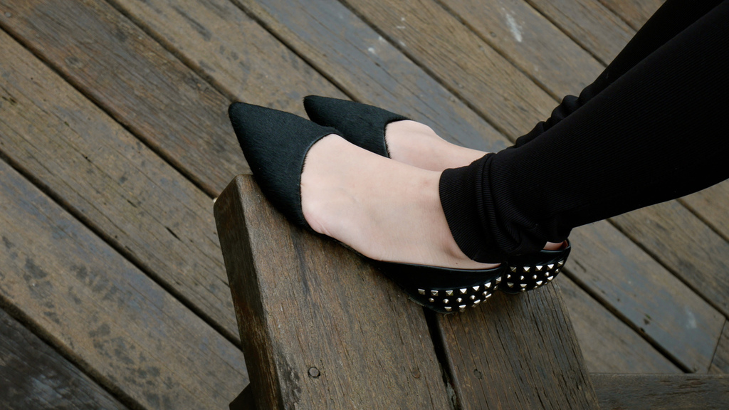 我一直都非常愛穿尖頭鞋,這雙也是皮毛拼接皮革,搭配上一點卯丁讓黑色尖頭鞋再增添一點個性。