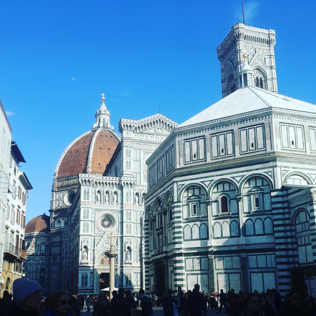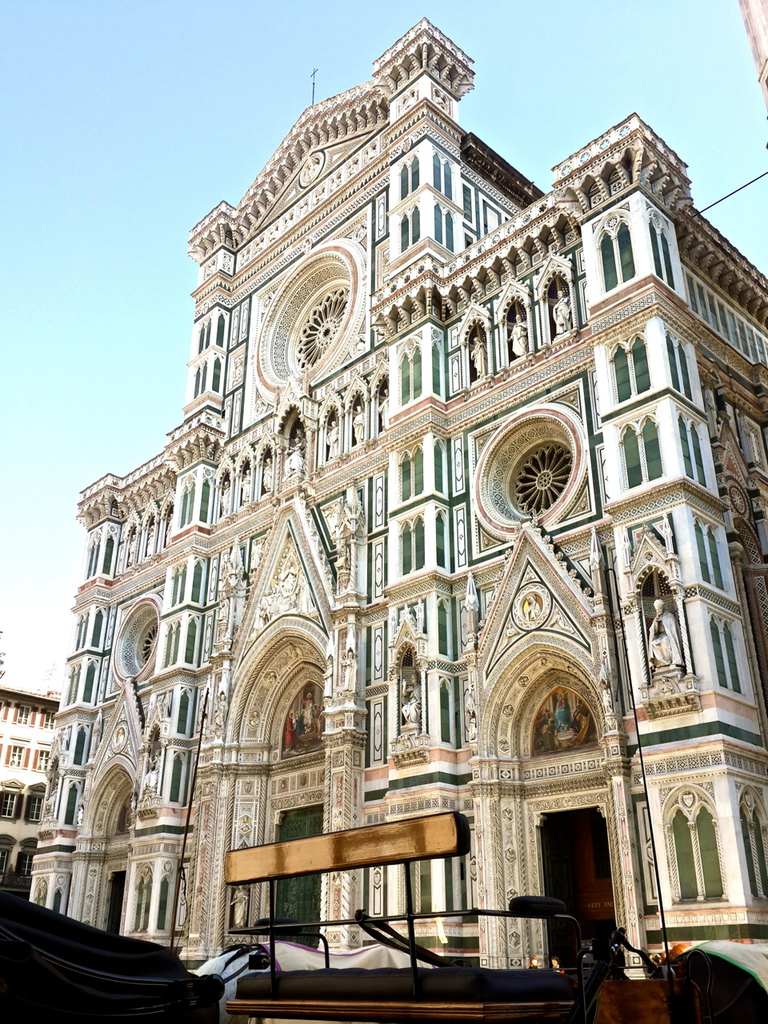 翡冷翠,又稱佛羅倫斯,在意大利文裡是百花之城的意思。這個在徐志摩筆下的浪漫城市,很容易讓你對他一見鍾情。她是如此的迷人,有著從文藝復興時代流傳至今的優雅,悠閒的步調讓你完全不想離開。還記得那天剛下火車的時候,她給了我一個大晴天。放好行李從旅館走出來沒多久,就看到眼前這個由粉紅色、粉綠色所建築而成的「聖母百花教堂」Basilica di Santa Maria del Fiore。美的令人難以置信,我從未見過有著如此浪漫色調的教堂,給了我一種不真實的童話感,粉嫩粉嫩的,再配上他的名字「百花教堂」你真的會覺得自己身處在一個很夢幻的世界。在翡冷翠的那幾天,不管經過幾次,我總是會停下腳步對她一拍在拍,一點都看不膩。我很多來過意大利的朋友,都表示佛羅倫斯是他們最喜歡的城市,這裡雖然不像羅馬那樣遍地古蹟,也沒有威尼斯的奇幻情調,但就是有一股非常獨特的魅力會讓你想要再三造訪。同時,這裡非常適合自由行,因為城市本身並不大,隨便亂繞都會走到你要去的地方。我們在這裡待了三天,第一天去了烏菲茲美術館,第二天逛逛城裡,第三天去了托斯卡尼的小城鎮Siena曬太陽。我們住在一間很棒的青旅,名字叫[my friends]就在車站的附近,老板娘熱情的不可思議。他聽到我們要去siena的那天,幫我們在水壺裡面裝了滿滿一瓶的自家釀葡萄酒,想起來都覺得很貼心。聊天的時候,她也很認真地跟我們分享佛羅倫斯好玩的地方,其實這次意大利之旅我們真的住到了很多很棒的民宿。搞的我朋友都一直嚷嚷著說她也要開一間。我想能分享自己鍾愛的地方給第一次來的旅客,應該是件很幸福的事。忘記那天跟老板娘聊到什麼,我只記得她說: 「我並不想變得富有,我想要知足並且保持謙遜。」我想,她一定心靈上非常富足才能說出這種話吧。