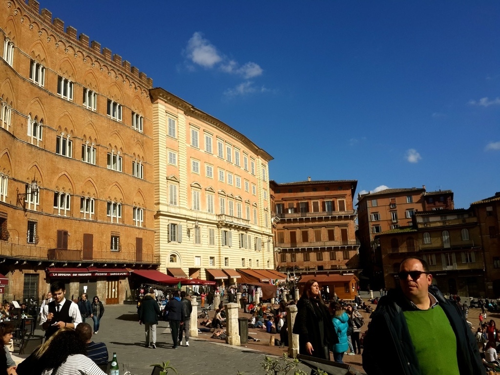 那我們就來看看這裡主要的景點吧。領主廣場Piazza del Campo,這是一個扇形廣場,並且帶有點斜度,號稱是全歐洲最美的廣場之一。