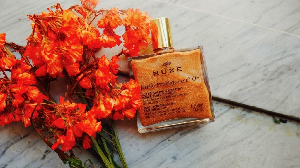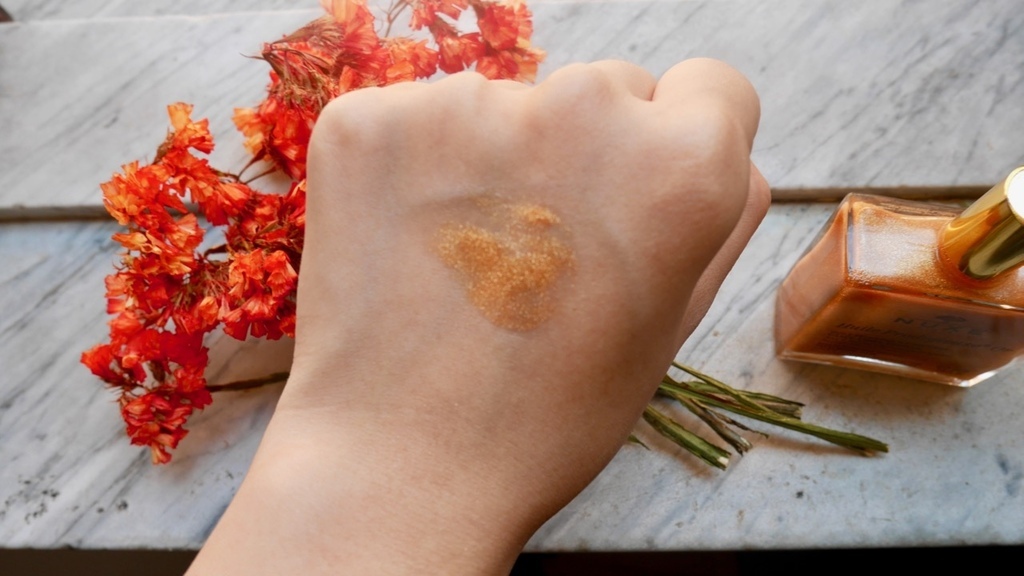 所以今天,就和大家分享一下,我在想要表現出「毫不費力」時,所用的心機小法寶。這罐來自巴黎的NUXE護理油,相信大家都知道。除了臉部之外,身體甚至是頭髮都可以使用。人到了一個年紀之後就會開始使用油狀的保養品(比方說我本人),或是在氣候乾燥的地方也很適合,而且保養油很適合拿來按摩,總之,就是個居家必備的概念。他們出了炫亮版,也就是在原本的配方裡面,加上微礦物質,創造出一個閃亮的金粉效果。我個人最喜歡的用法是擦在鎖骨上,可以讓肌膚看起非常有光澤。也可以加在底妝裡使用,創造出一個自然的打亮效果。