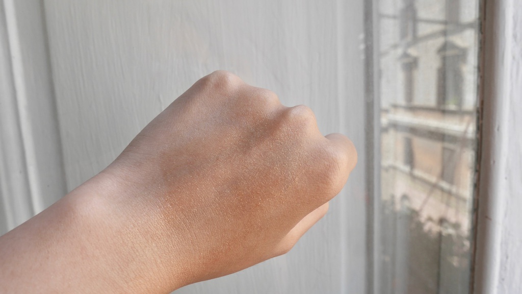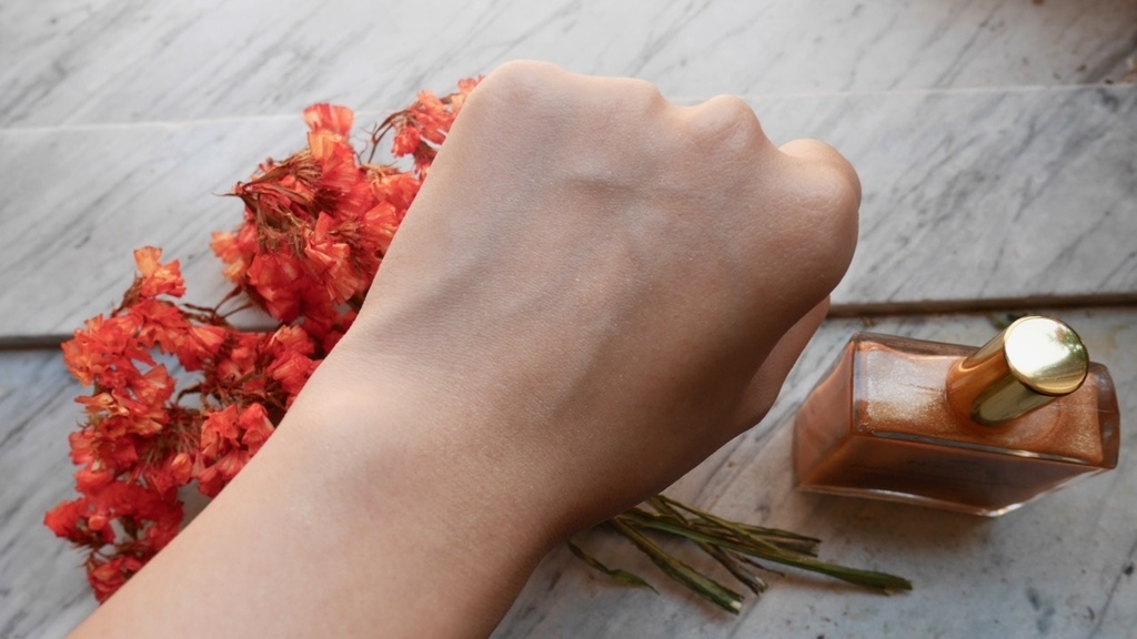 因為想要讓大家看清楚一點,所以我倒了很多在手上。他的亮粉非常細緻,一點也不俗豔。而且雖然是油狀的,但卻很好吸收。