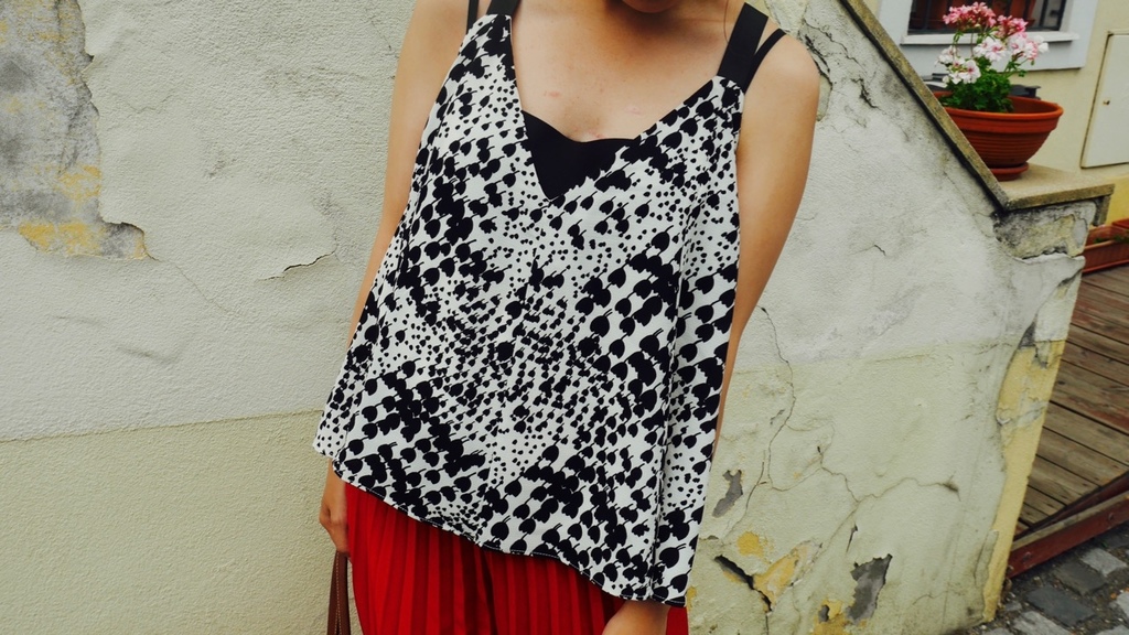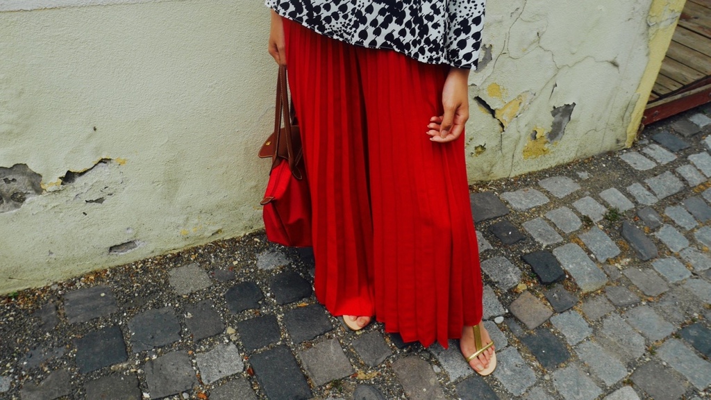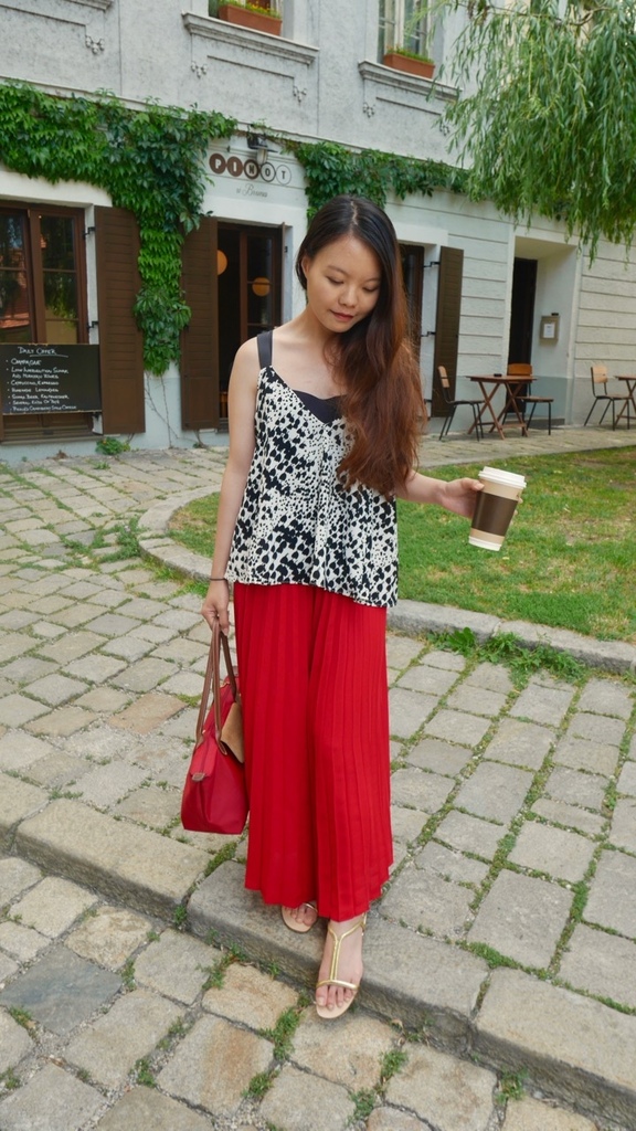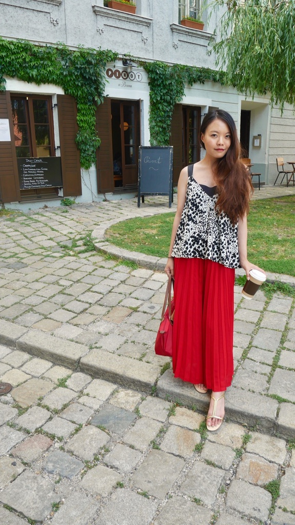 紅色的百摺寬褲很飄逸,而且百摺單品是今年一定要擁有的。(最好是百褶裙,我已經看到了無數篇穿搭文在歌頌它)