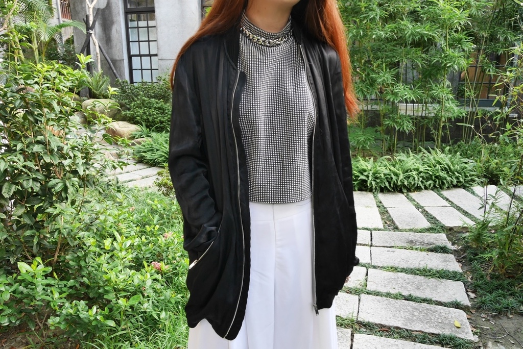 那就再度回到穿搭時間吧。最近很流行這種款式的外套。短版的飛行員外套,又稱MA-1。我身上這件其實不算是正統的MA-1。MA-1指稱的原本是美軍飛行員專用的軍風夾克,他極簡的衣型和特殊的尼龍材質,可以防風防水,曾在197-~1980年代成為當代年輕人最鍾愛的款式之一。但隨時代的變化,不管是衣服的質料、配色、花紋等,都有了更多元的組合。我身上這件就是他的變形。