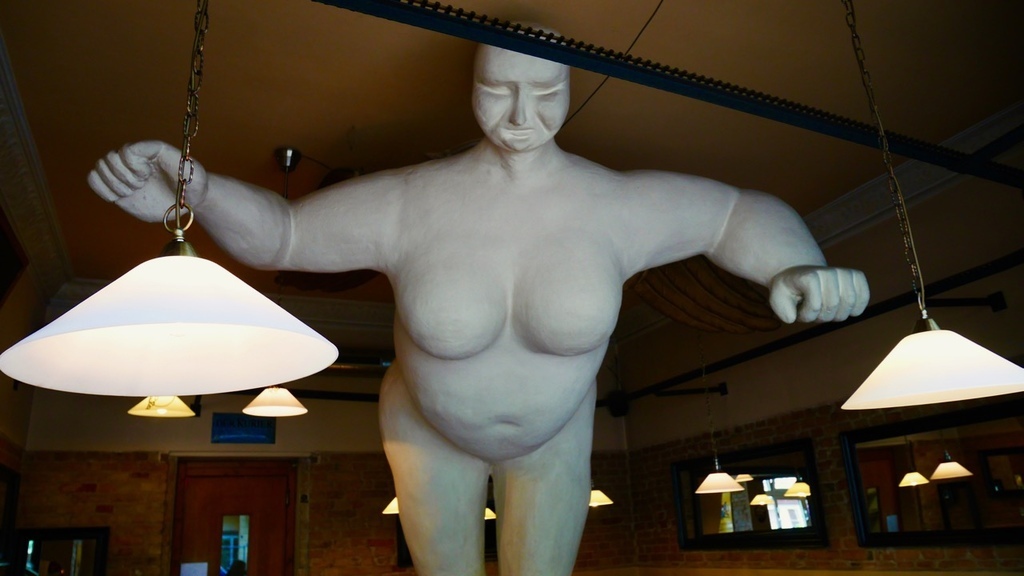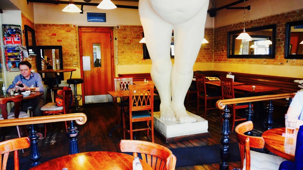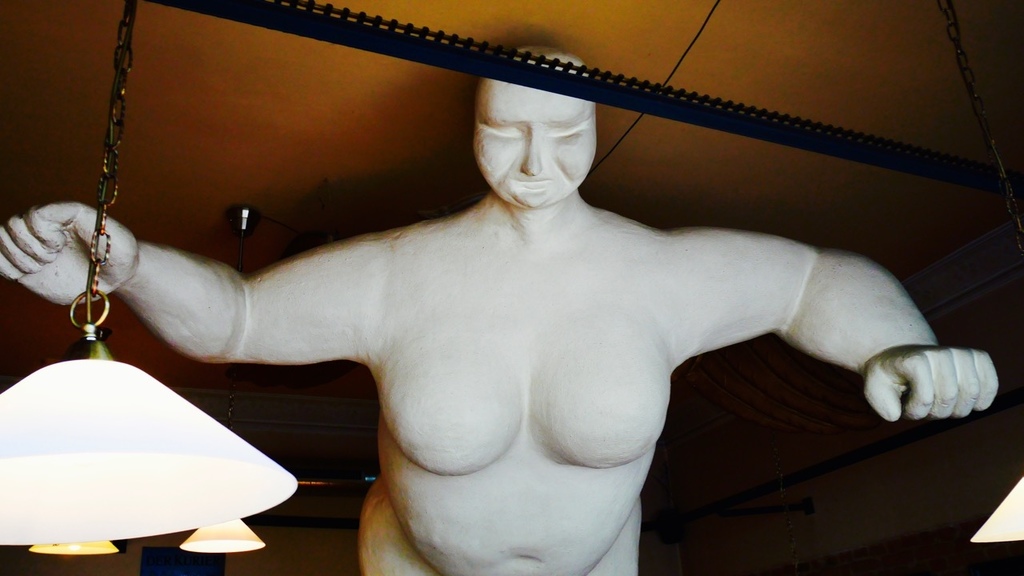 酒喝完了,讓我們把鏡頭拉到「dicker Engel 」,中文翻譯就是胖天使,這是一間專門賣德國傳統菜餚的道地餐廳。至於為什麼要叫胖天使,我想下圖的圖片可以為大家說明得一清二楚。站在店門外,就可以看到這尊巨大無比的雕塑,佔滿整個畫面。但我也是現在才知道她是天使。店內的裝潢走復古溫馨路線,餐點份量都超級大份,我點的那份豬腳,兩個少女都不見得吃得完啊!