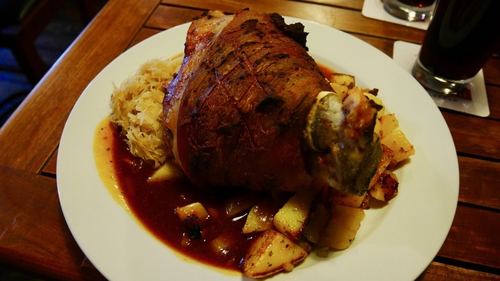 烤德國豬腳,配料是酸菜與烤馬鈴薯