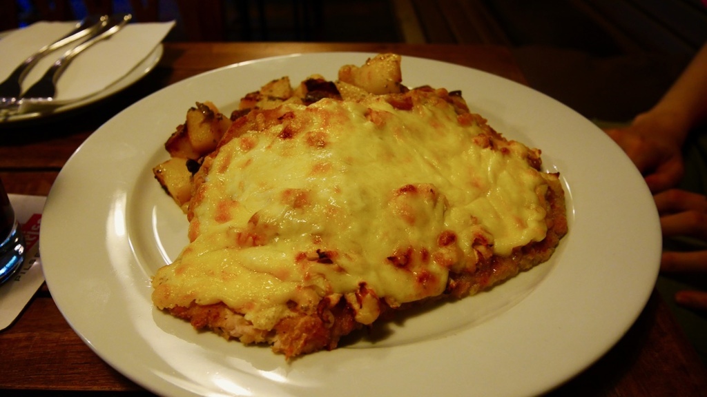 起司豬排(旁邊的配料印象中好像是烤蘋果)很好吃,份量很大,起司超濃