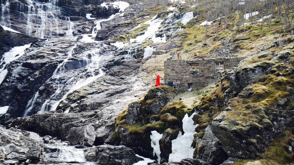 這真的超妙的,你們知道那邊有多冷多荒涼嗎!!!紅衣女子就這樣出現然後在山谷中跳舞(其實有很多個,他們會在其中跳來跳去製造出一種眼花撩亂的神奇效果)