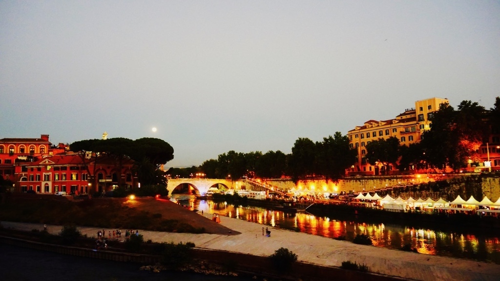 現在的台伯河,已經是個熱鬧的地方。我還記得我那時候去的時候覺得超級美,而且還滿月。湖面很平靜,配上昏暗搖曳的燈光,倒映出整片風景。那是一個令人心醉的時刻,也是快要離開羅馬的日子,每天都想過得很用力。但結果只是想想,因為那時候進入了夏天,夏天的羅馬根本是個烤爐,中午出門真的會中暑倒在外面,所以後期我都下午才出門。而且夏夜的羅馬很涼爽,我和朋友會晚上拿著啤酒,到樓下的廣場邊喝邊聊,就像其他愛在路上閒晃的羅馬人一樣。而今天介紹的這個夜間市集,也只有夏日才有,只能說,不同的季節有不同的風景。但如果要去羅馬我還是推薦春天或秋天去,像是三、四月份就很合適,我第一次去的時候就是三月底,氣溫微涼,很適合在路上走。這很重要,因為羅馬的景點就算你走斷腿也看不完,所以一定要挑個好天氣才行。而且春天的時候路上都開滿了各式的花,每個角落都是風景。