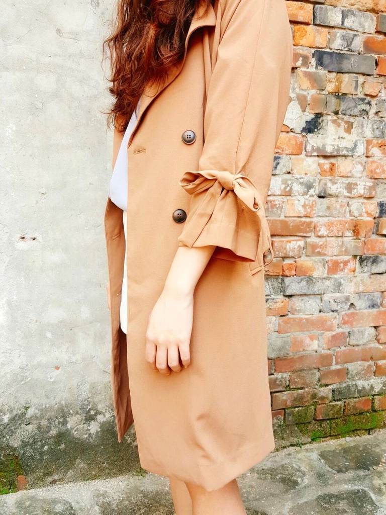 全身上下都是雪紡的材質,就連外套也是。袖子的長度是不長不短的五分袖,還在袖口的地方打了一個蝴蝶結,增添一點小女人的感覺。