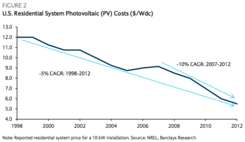 亚利桑那州就如此,该州电厂耗资300余万美元用于但对太阳能的采用。巴克莱称:“尽管他们会延缓太阳能的使用,电厂获得的仅是短暂的安心。随着太阳能系统安装费用每年下降约10%,我们预计安装的速度将在2014年底前复苏。尽管我们需要更多月份的数据以证实这一判断,这有望成为技术/成本曲线如何快速的超越监管应对措施的案例。