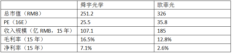 主要生产光学产品,产品包括光电产品(手机相机模组及其他光电模组,15年占比收入77%)、光学零件(玻璃/塑料镜片、平面镜、棱镜及各种镜头,15年占比收入21%)和光学仪器(显微镜、测量仪器及分析仪器,收入占比很小,连续4年在5%以下,且几乎没有增长),是中国第二大镜头供应商(目前舜宇光学的市场份额约为10-15%,vs.台湾大立光电的40%),目标是3年之内超过大立光电成为第一大供应商。