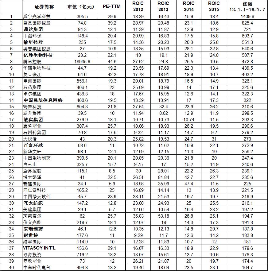 3)41%的公司净利润从2012年开始连续四年正增长;40%的公司ROIC连续四年超过10%,其中10家的ROIC在这四年间逐年上升。