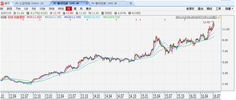 股价走势图:12年初至今涨幅1.8倍,不同于以上9只股票,维他奶股价16年初创出新高,至今还比高点低10%左右。