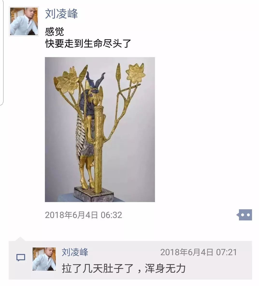 今年6月初,他连续拉了几天肚子,浑身无力。当天,刘凌峰还发了一条朋友圈:“感觉快要走到生命的尽头了。”当时,这只是他的一句玩笑话,他并不知道自己的身体出了大问题。