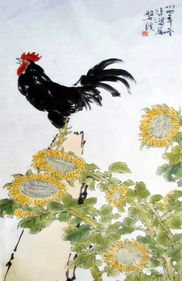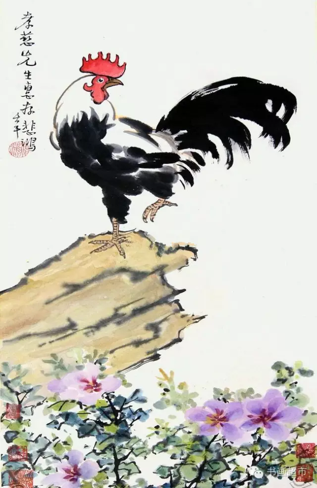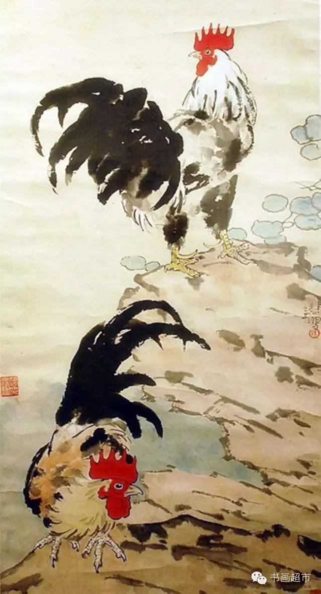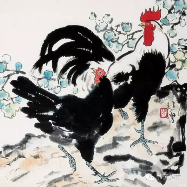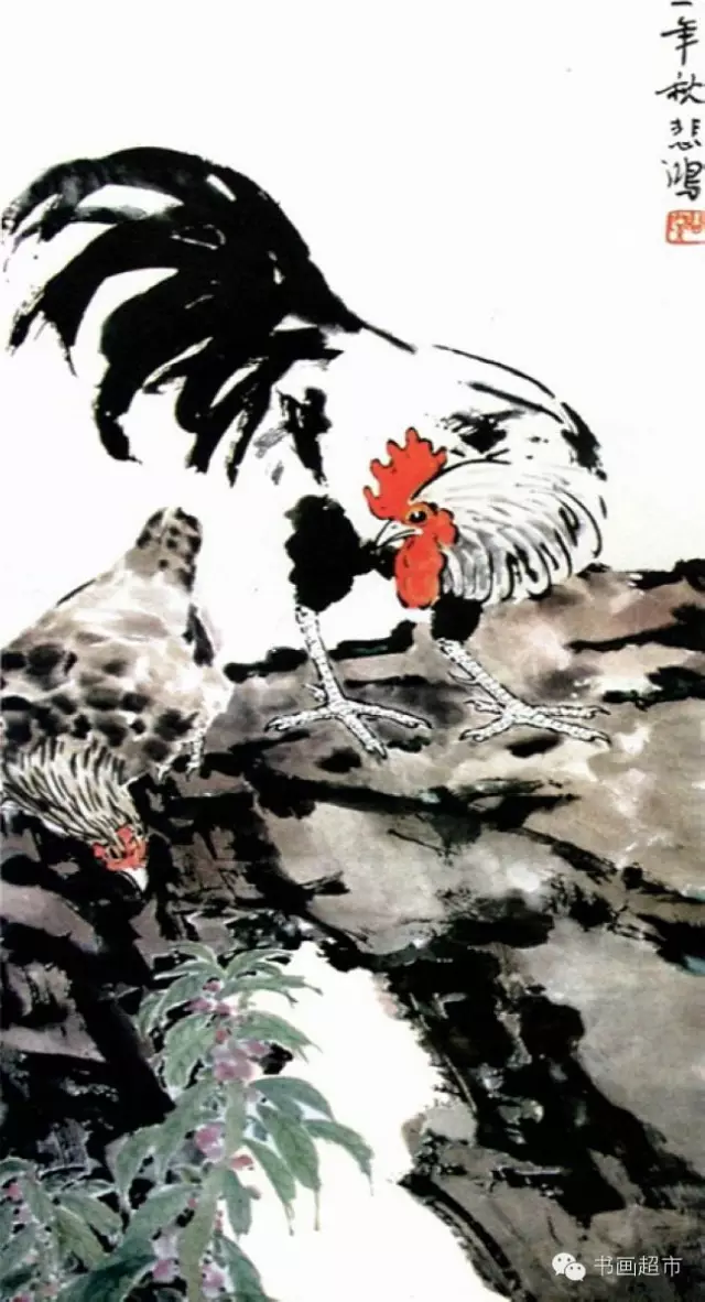 徐悲鸿在绘画创作上,反对形式主义,坚持写实作风,继承我国绘画传统,吸取西画之长,创造独特风格。长于国画、油画、尤擅素描。徐悲鸿作画,不论画马、画鸡或其它动物,都有所寄托,有所寓意。他所画的鸡,多是昂首挺立、怒发冲冠的公鸡,鸡的造型极为写实,尤其冠与爪之刻画,笔法精细严谨,尾巴以浓墨大笔扫出,冠红如火,尾黑如漆,在粗与细,红与黑的对比中呈现出一种和谐。徐悲鸿将笔下的雄鸡比作勇士,表达了中国人民不屈不挠的民族精神和高洁的品格,也蕴含了对和平、平安的祈求和祝福。徐悲鸿大师笔下的奔马名满天下,而他画的鸡也同样令人拍案叫绝,可谓千古绝唱!
